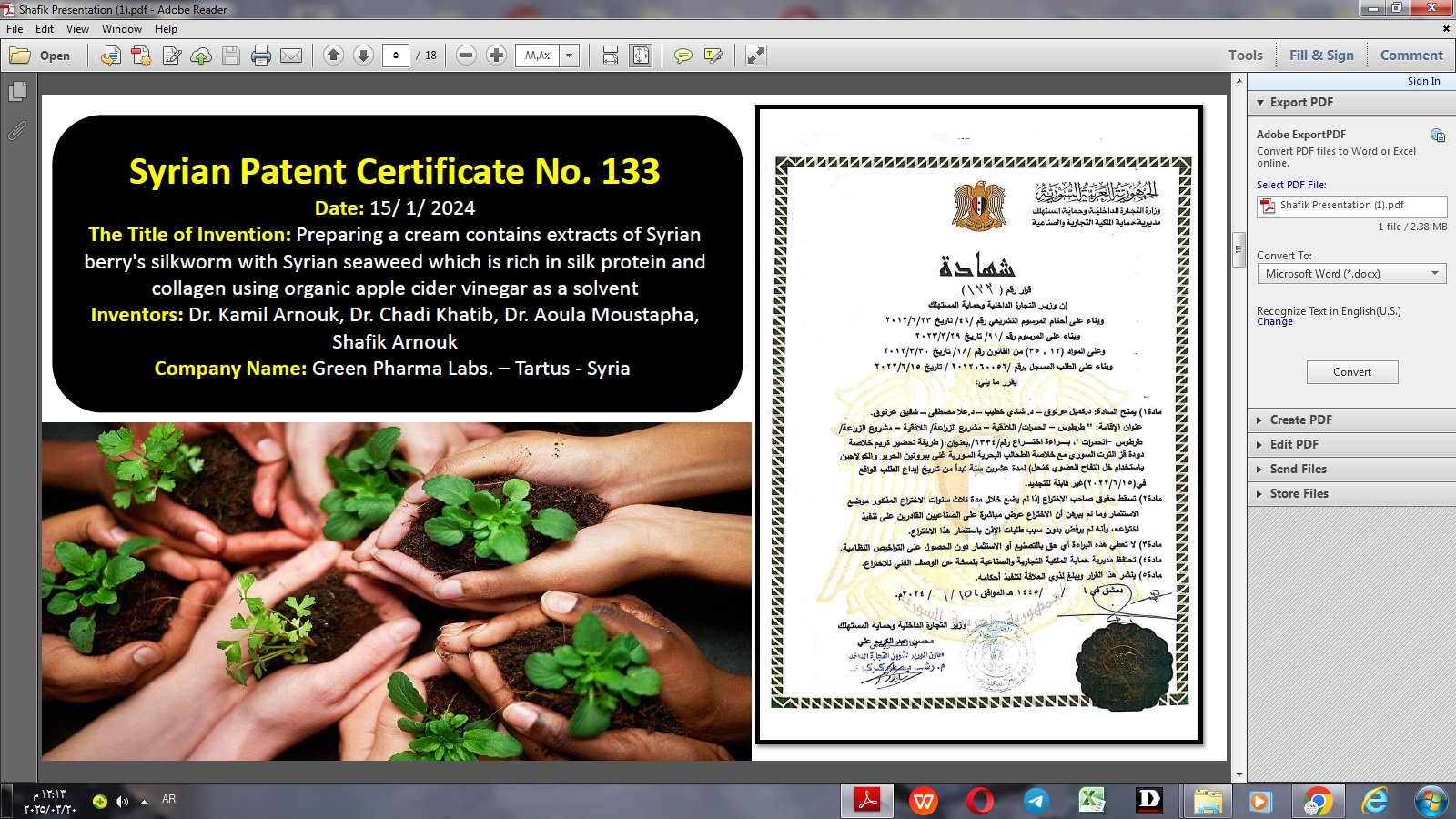 Greenpharma labs has participated in numerous international conferences, exhibitions, and competitions and has won numerous local and international awards, most recently receiving the gold medal at the International Innovation and Invention Exhibition in Canada (ICAN 2024) and the Best Invention of 2024 Award for its patented natural product, Green Collagen and Silk. This revolutionary, environmentally friendly cream is made from silk protein extracted from the Syrian silkworm and marine seaweeds collagen. Green Collagen and Silk was also ranked among the top ten inventions in all categories and took second place, with approximately 756 innovations from 50 countries participating in the exhibition.